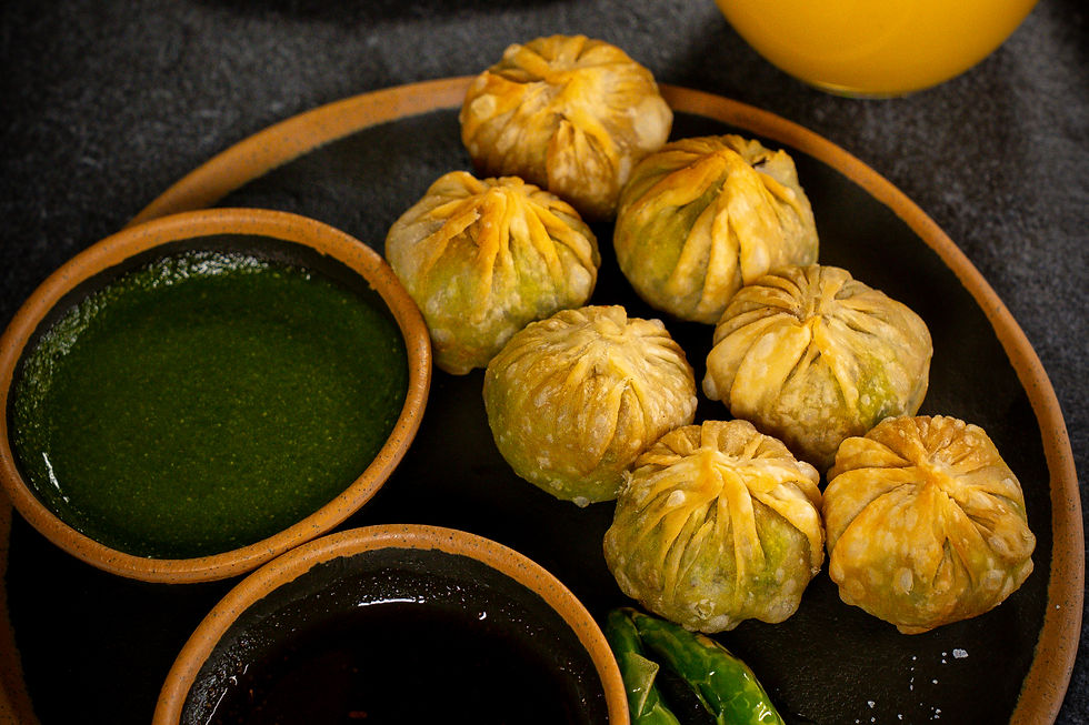 At its core, Lilva Kachori is simple. A round, deep-fried pastry filled with spiced green pigeon peas (lilva), served with two house chutneys: one mind, one tamarind.